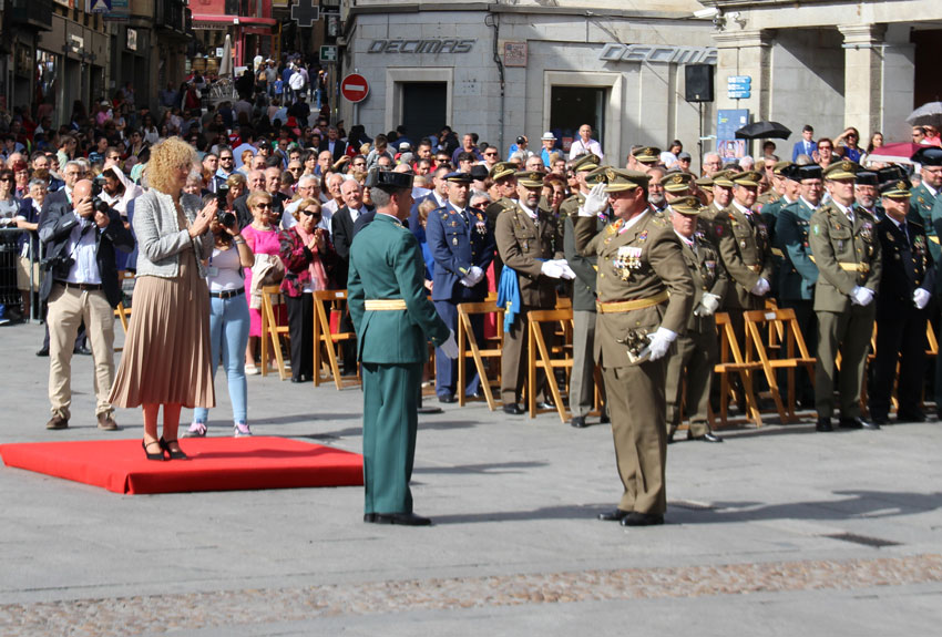 A los pies del Acueducto la ceremonia no cambió un ápice respecto a la tradicional, en el patio del cuartel de Segovia. La principal novedad fue la intervención de la alcaldesa, Clara Luquero, se supone que por aquello de haber pagado en su día, en 1844, los gastos de instalación. Luquero anunció que habrá medalla de la ciudad para la Guardia Civil, de plata si este año, de oro si en 2020 (pues la de este año ya se entregó, al Mester, y solo se da una al año).  Luego de la entrega de condecoraciones, palabras del teniente coronel, seguido de la subdelegada del Gobierno Lirio Martín. Para terminar con el homenaje a los caídos y desfile militar en petit comité -Ramírez volvió a reiterar la falta de efectivos por las limitaciones a las reposiciones de jubilados como principal problema de la comandancia-, una compañía de honores, gastadores y el refuerzo de tambores y cornetas de Artillería, Avenida Acueducto arriba.
