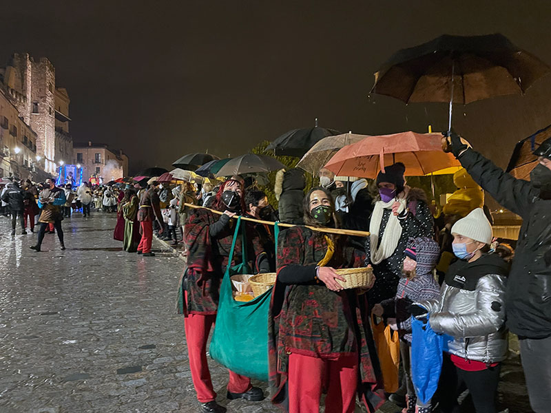 El jolgorio en el trayecto hasta la plaza de la Artillería lo ponían la Orquestina del Valle, la Troupé de la Merced y Os Batucones, en la vanguardia de los cortejos de cada rey, formados por voluntariosos y empapados repartidores de caramelos y carbón dulce.
