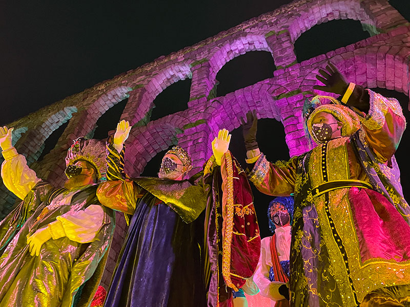 Mientras, otros varios miles de espectadores esperaba con paciencia frente al escenario del Acueducto —de nuevo el espacio acotado para discapacitados estaba desaparecido— animados por la Unión Musical Segoviana, mientras en la pantalla gigante repetía una y otra vez el vídeo promocional que ha sido eje de la campaña de Navidad del Ayuntamiento —si, Artabán, otra vez, y también el reiterado deseo de felicidad de la alcaldesa— salpicado por breves conexiones televisivas en directo desde el recorrido de la cabalgata.