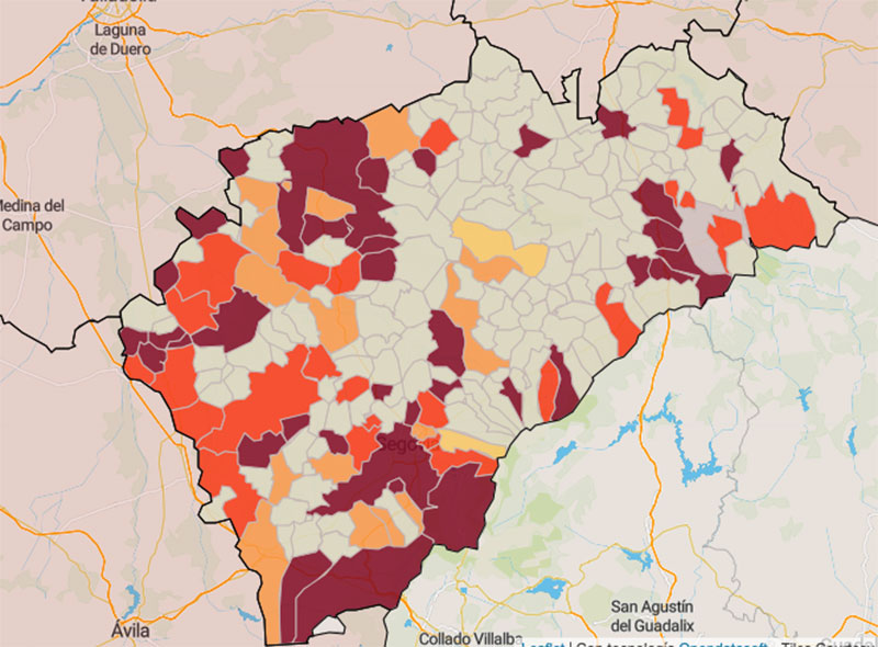 Además, la mirada pormenorizada a los municipios de la provincia sigue reflejando el aumento constante del número de pueblos que sale de la “nueva normalidad” de la que gozaban la mayoría de las localidades hace sólo un mes. Hay 78 pueblos con diferentes grados de contagio y de ellos, casi la mitad (35) tienen tasas por encima de 500 casos por cada 100.000 habitantes. En ese grupo está Segovia capital, con 545,55 casos y también algunos de los pueblos más grandes: Cuéllar (569,41), San Ildefonso (605,48) o El Espinar (517,27). Llaman la atención tasas como las de Marazuela, con una incidencia de 4.166,67 casos por cada 100.000 habitantes. Hay 25 pueblos en la franja de riesgo “Alto”, con tasas entre 300 y 500 casos, 16 más en riesgo “Medio” y sólo dos (Trescasas y Cantalejo) en “Bajo”, es decir, con tasas entre 50 y 100 casos.