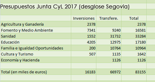 La Educación se lleva más de 17 millones en total, por casi 11 Familia e Igualdad de Oportunidades. Cultura y Turismo prevé un gasto de 1.6M€. En este apartado destacan los 900.000 presupuestados para las Edades del Hombre y 211.000€ para la Catedral de Segovia (restauración cubierta de la Capilla del Santísimo) y la cubierta de San Millán 153.000. En Economía y Hacienda, con 1,1M€, destacan la transferencia al Centro Nacional del Vidrio (200.000€) y los 531.000€ para instalaciones deportivas a municipios.