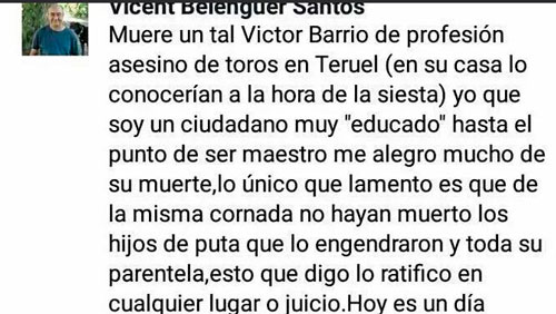 Visto para sentencia el juicio contra Vicente Belenguer, el maestro valenciano que tras la muerte del diestro sepulvedano Víctor Barrio colgó comentarios injuriosos y vejatorios en las redes sociales. “Me alegro mucho de su muerte, lo único que lamento es que de la misma cornada no hayan muerto los hijos de puta que lo engendraron”, se leía en su perfil de Facebook a las pocas horas del trágico fallecimiento del torero. El juzgado de lo penal de Segovia le sentaba en el banquillo acusado de un delito de incitación al odio en la diminuta sala de vistas ubicada en la calle Teodosio el Grande, no mayor que un cuarto de estar y en el que se hacinaba una veintena de personas (dentro) y otra decena, muchos testigos, en el igualmente diminuto vestíbulo. Francamente, espectáculo tercermundista que se repita cada vez que la sala celebra una vista más o menos mediática.