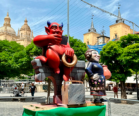Hasta las 12 de la noche este “ninot segoviano” se podrá contemplar en la plaza Mayor, momento en el que se encenderá el fuego y el diablillo y la aguadora desaparecerán devorados por las llamas.