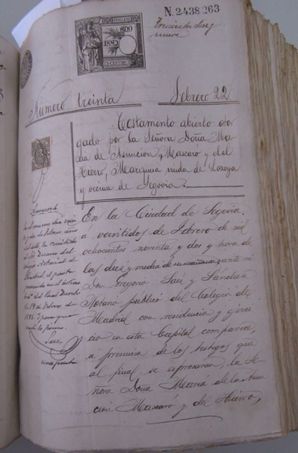 El archivo Histórico Provincial de Segovia presenta en septiembre como tesoro oculto del mes el testamento datado de 1892 perteneciente a la marquesa viuda de Lozoya, doña Asunción de Mascaró. Asunción procedía de una rama pobre de los condes de Cedillo y se casó con Domingo Contreras, marqués de Lozoya en el tercer matrimonio del entonces poseedor de un título que se remonta a los tiempos de Carlos II y de gran influencia en la provincia de Segovia. Había por tanto una gran diferencia de edad entre los cónyuges de manera que la marquesa consorte quedó viuda al poco convirtiéndose en heredera de los cuantiosos bienes del fallecido esposo, según explica la Junta en la nota de prensa que presenta la pieza del mes.