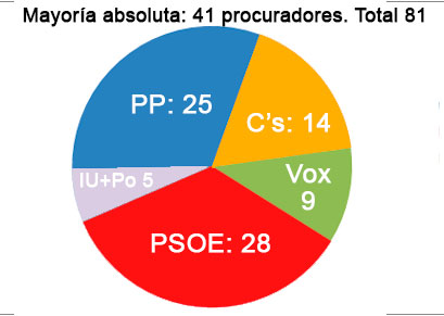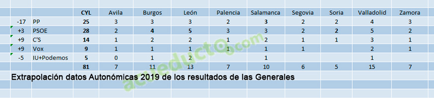 Que se lo pregunten a los partidos, que no había transcurrido el 28 de abril y ya ardían los Excel con las derivaciones a locales, y con más razón si cabe a las autonómicas. Son 81 escaños a repartir entre 9 circunscripciones, de los 15 de Valladolid y 13 de León a los cinco de Soria y los seis de Segovia (así estamos, peleando con Soria por no ser la provincia menos poblada de la región, perdiendo un procurador respecto a 2015). Según la extrapolación el PSOE, primera fuerza en votos, tendría 28 procuradores, por 25 el PP, pero el hundimiento de IU y Podemos (que esta vez acudirá en coalición con Equo, en tanto IU va coaligada con PCAS y Anticapitalistas) dejaría a la mitad, 5, los procuradores morados. Resultado, la suma de PSOE y Podemos-IU no cuadra.