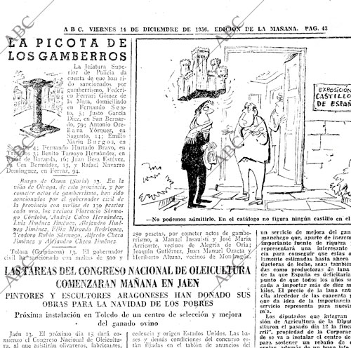 Muchos años después, no desde luego en los días posteriores a los hechos, mi padre no escondía el orgullo de ver su nombre en la Picota de los Gamberros. Era una sección del ABC en la que se daba cuenta de los sancionados “por gamberrismo“. Le trincaron en Cea Bermúdez en diciembre de 1956. Y no, no es que mi padre fuera tonto o corriera cual tortuga, como pensarán sus nietos hoy, en tiempos del spray y zapatillas Nike de salir volado. El asunto es que por aquel entonces para las pintadas alguien debía cargar con el cubo de pintura (como recalcaba mi padre siempre que refería la anécdota). Te ponías perdido, así que la policía lo tenía fácil. ¿Qué hace usted a 100 metros de una pintada medio hecha, fresca, que dice Franco Cabr…, con un cubo de pintura roja a 10 metros y los zapatos impregnados en la susodicha sustancia idéntica a la del cubo?, le inquirieron. Padre balbuceó. Acabó en comisaría, claro. Y a los pocos días su nombre aparecía junto a un chiste de Mingote e información relativa a “pintores y escultores aragoneses han donado sus obras para la navidad de los pobres”.