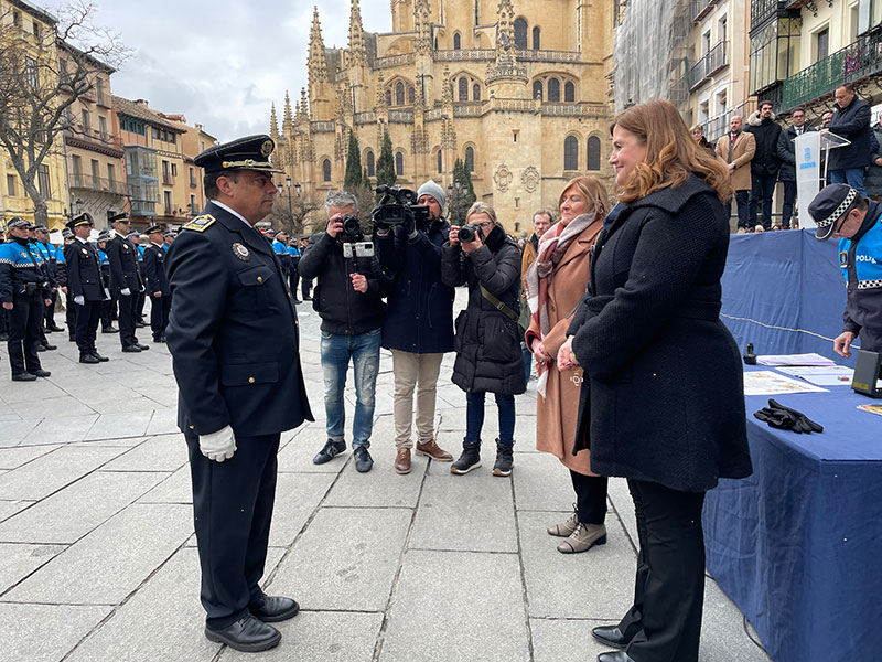 Unos 70 de los 108 miembros de la actual plantilla de la Policía Local de Segovia -faltaban los que trabajaron la noche anterior y los que estaban de servicio en ese momento- formaron durante la mañana de este 1 de marzo en la plaza Mayor para celebrar la festividad del Santo Ángel de la Guarda, patrón del cuerpo, en una parada presidida por un intenso frío, no sólo climatológico, también anímico, ya que se mantenía muy presente la polémica de los últimos días sobre la actuación del acueducto del 8 de septiembre en corrillos y conversaciones, también en el escenario donde se concentraban unas cuarenta personas, entre miembros de la Corporación y el resto de las autoridades invitadas al acto. Precisamente, los agentes que protagonizaron aquella actuación formaban parte de la lista de los distinguidos, pero por otras actuaciones meritorias relacionadas con otras actuaciones. En un trámite rápido y casi sin miradas directas, el agente que resultó herido aquella mañana, incorporado en enero, de uniforme, y el oficial, de paisano, por estar de baja laboral (hubo varios en esa situación) recibieron sus premios de manos de la alcaldesa, Clara Martín, y del intendente, Julio Rodríguez, respectivamente. También participó en las entregas de diplomas y medallas la concejala, Raquel de Frutos.
