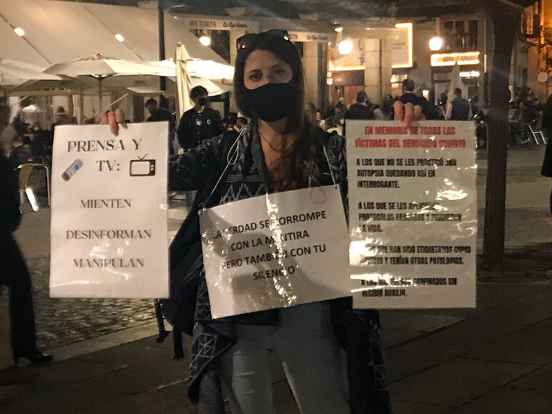 Con una plaza Mayor repleta de ciudadanos ocupando las terrazas de los bares o simplemente paseando por la zona mientras apuraban las horas de ocio antes del inicio del toque de queda, los participantes en la protesta acudieron también al lugar a la hora fijada, las 20.00 horas, aunque lo hicieron de manera absolutamente pacífica. Eran unos 25, muchos de ellos con el rostro enmascarado —era la noche de Halloween— y portando o llevando prendidas en la ropa cartulinas con lemas escritos contra el Gobierno, las medidas de contención adoptadas, las carencias sanitarias o simplemente negando la existencia de la pandemia.