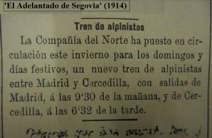 El interesante folleto de propaganda de la temporada 1914-1915, editado por los Caminos de Hierro del Norte de España, nos dan una idea del auge que el ferrocarril tomaba en el desplazamiento de masas (la prensa local segoviana se hizo eco de la iniciativa, como ‘tren de los alpinistas’).