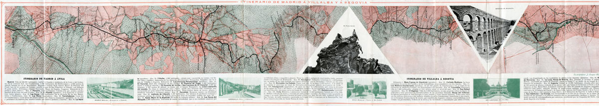 Km. 63. Segovia. Ciudad de 15000 habitantes, situada sobre una roca de 100 metros de altura y rodeada de un ameno valle que bañan el río Eresma al Norte y el arroyo Clamores al Sur. Maravilloso Acueducto romano que data del reinado de Augusto, magnífica Catedral de estilo gótico, soberbio Alcázar de arquitectura arábiga, contruido por Alfonso VI, conventos de Jerónimos del Parral y Santa Cruz, Iglesias del Corpus Christi y de la Vera Cruz, casa de los Picos y del comunero Juan Bravo. A 11 kilómetros de Segovia se halla el Real Sitio de San Ildefonso o La Granja, muy frecuentado en el estío por la frescura de su clima, la hermosura de sus paisajes y el poderoso atractivo de sus incomparables jardines y fuentes. Un cómodo servicio de correspondencia por carretera, establecido por la Compañía del Norte, conduce de Segovia a La Granja