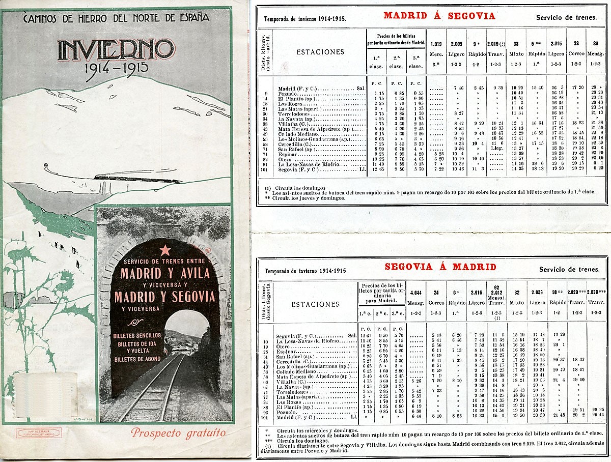 Portada, horario y precios del folleto de los ‘Caminos de Hierro del Norte de España’, Invierno 1914-15, Madrid-Villalva-Segovia.