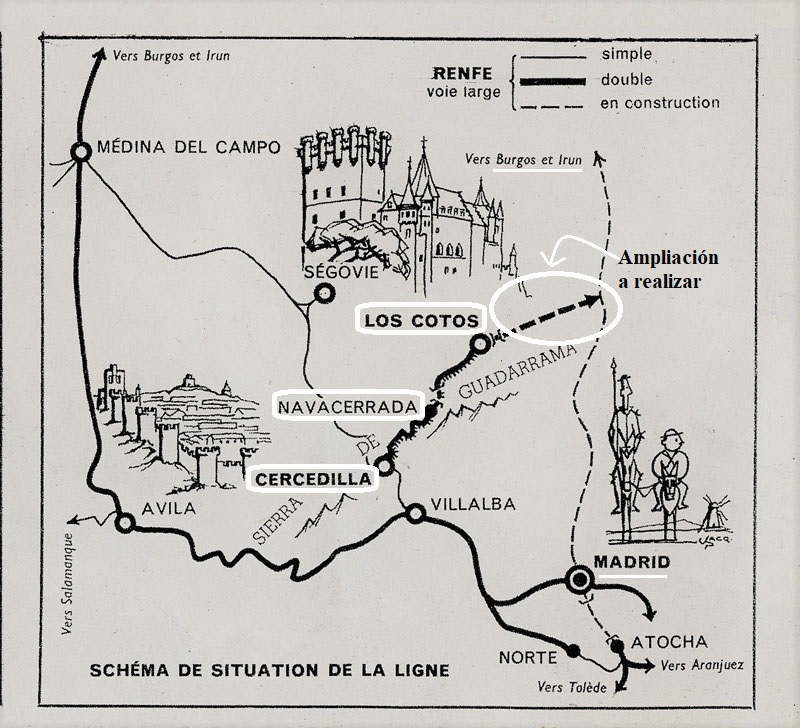 […] De los Cotos, la ligne doit, dans l’avenir, être prolongée d’un evingtaine de kilomètres por rejoindre la nouvelle ligne en construction par la R.E.N.F.E. de Madrid vers Irun par Burgos.