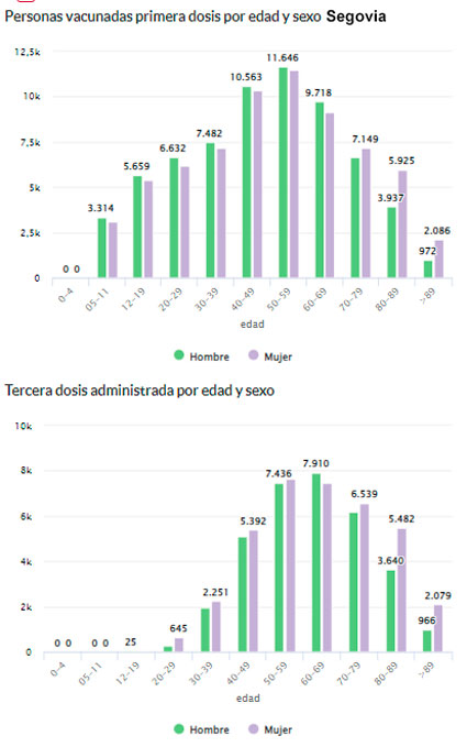 ¿Pero cuál es el porcentaje real de cobertura de vacunación por edades? Pues según la población por edades cifrada por el INE, entre los mayores segovianos de 69 años sería superior al 90% en ciclo completo y del 85% en tercera dosis. Pero a partir de la cincuentena la cobertura de vacunación es del 82% pero solo del 54% en tercera dosis, y del 81% y 41% en los mayores de 40 años.