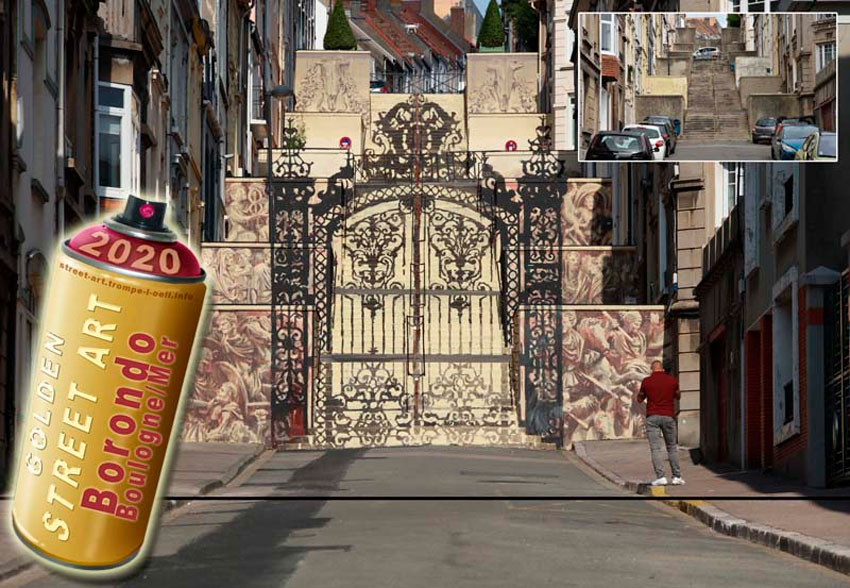 Para la ocasión se seleccionaron frescos de 38 localidades franceses, los más espectaculares. De los que en febrero pasaron 10 a la gran final. Ganó, y por amplia diferencia de votos, el de Boulogne-sur-Mer (Pas de Calais), firmado por Borondo. Es un prodigioso trampantojo que convierte una sucia y fea escalera en la antesala de un palacio rococó con sabor granjeño. Vale la pena recorrer ahora ese callejón, ni que sea a través del vídeo facilitado por el municipio galo.
