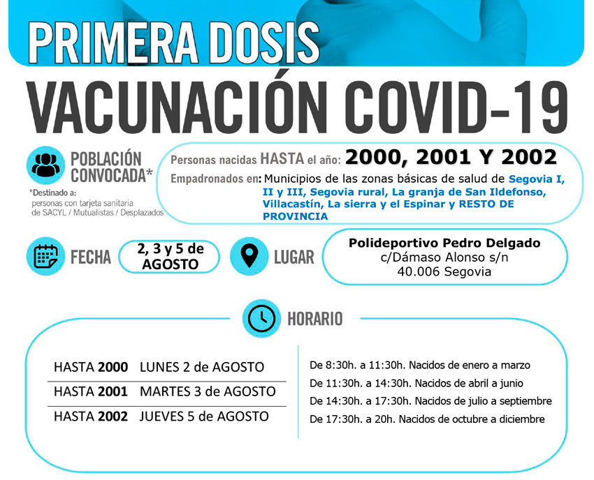 En Cantalejo, punto de referencia para los residentes en las zonas básicas de salud de Cantalejo, Sepúlveda, Riaza, Fuentesaúco de Fuentidueña y Sacramenia, y al que también pueden acudir los usuarios de la zona de salud de La Sierra, el martes, 3 de agosto, se incorporarán a la vacunación los nacidos en 2000; y el jueves, 5 de agosto, los nacidos 2001 y 2002. Este llamamiento es igualmente extensivo a quienes nacidos en 1962 y posteriores no hubieran recibido aún la primera dosis. (Ver distribución de horarios).