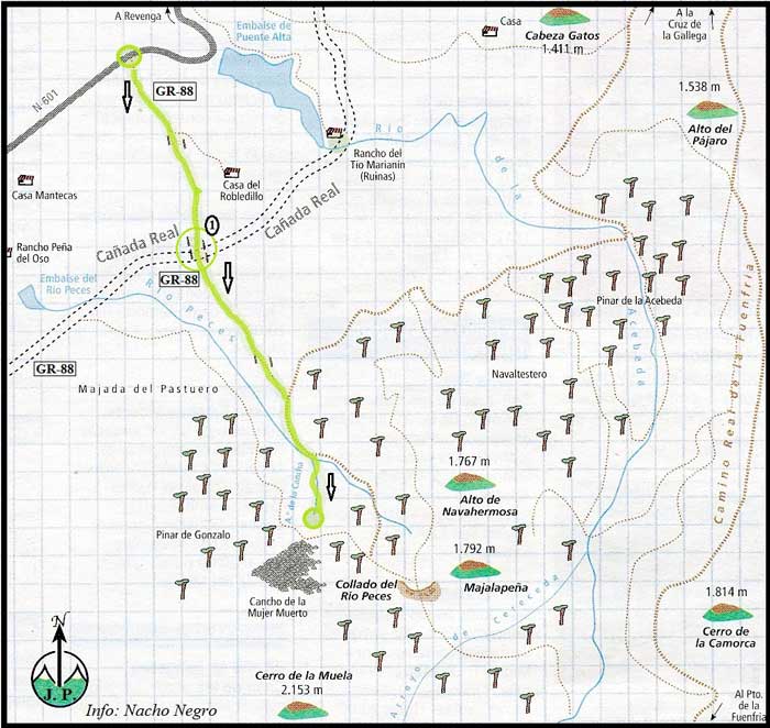 A mano izquierda la cañada va camino de las ruinas del Rancho Marianín, situado en la cola del pantano de Puente Alta. Por la derecha continúa el Gran Recorrido, faldeando la Mujer Muerta, hacia el puerto del Pasapán para acceder a San Rafael (ver plano).