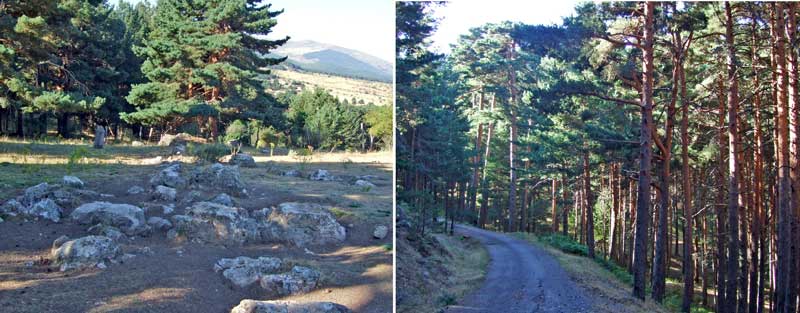 Siguiendo de frente a nuestra marcha, iremos dejando los chaparros de encina para adentrarnos en el rectilíneo mundo de los pinos silvestres de Valsaín -marchamo de calidad en el mundo entero-. La senda no ofrece gran dificultad, al estar marcada por rodadas de vehículos de uso ganadero. Caminamos paralelos al río peces, que queda a cierta distancia por nuestra derecha (ver plano).