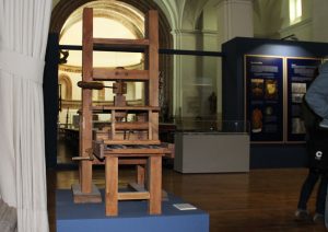 Se ha habilitado  la iglesia como sala de exposiciones, con una suerte de pecera que separa la zona de culto de la parte expositiva. El resultado es digno de verse. Hay tres aspectos a destacar, por un lado los paneles informativos que hablan del tiempo de Juan Arias Dávila (quién era, cómo era la Castilla coetánea) y de los pormenores de la irrupción de la imprenta en Segovia y por ende en España (tipografías, papeles, tecnologías…). Junto a los paneles, obras de arte; hay tablas flamencas, una copia de Berruguete, cesiones del Museo de Segovia, incluso pintura contemporánea, todo concebido más como elemento decorativo. En tercer lugar, la imprenta y su producto, el incunable. Junto a reconstrucciones de una antigua imprenta de Gutemberg, cajas de tipista, material de fundición, incunables, los más de ellos procedentes de la propia biblioteca de la Complutense,  documentos históricos esenciales como la bula para la guerra de Granada o la Bula de Borja… ¿Y el Sinodal? Pues no está. Hay un faccsimil, hay enormes e interesantes plafones que nos adentran en sus características histórico-técnicas, pero la cosa emocional de acercarse al primer libro impreso en España no va a poder ser. Tampoco esta vez.