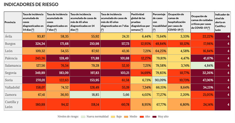 Tampoco dan tregua los indicadores que reflejan la incidencia acumulada de casos. Con la referencia de los diagnosticados en las dos últimas semanas, se sitúa en 349,89 contagiados por cada 100.000 habitantes. A una semana, 183,09 casos por cada 100.000 habitantes. Ambas casillas aparecen en las tablas en el color burdeos que indica la situación de “riesgo muy alto”.