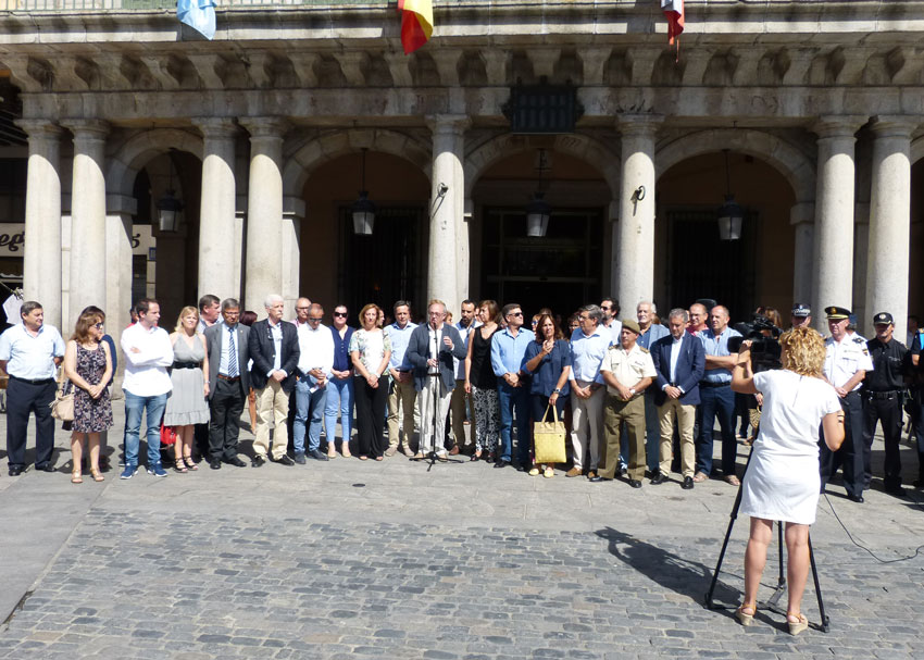 Unidad contra el fanatismo, el odio y la sinrazón. Segovia fue Barcelona al mediodía del 18 de agosto, con unos trescientos turistas, vecinos y políticos congregados en la plaza Mayor siguiendo la convocatoria general de la Federación de Municipios y Provincias en repulsa por la masacre de Barcelona. En ausencia de Clara Luquero, de vacaciones fuera de España, correspondió a Alfonso Reguera, alcalde en funciones, manifestar la solidaridad de Segovia con las víctimas y con la ciudad de Barcelona. A su lado, el presidente de la Diputación, Francisco Vázquez, y una presencia muy significativa, Mohamed El-Mizeb, presidente de la Federación de Comunidades Musulmanas de Castilla y León.