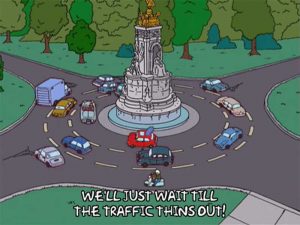 Ah, no prosperó la idea de Centrados de poner en marcha las turborrotondas en Segovia y eso que había un intenso debate sobre el asunto. Hay un capítulo de la serie de dibujos “Los Simpsons” que refleja los problemas de los conductores a la hora de gestionar esos encuentros de calles —la familia amarilla al completo pasa dos jornadas enteras atrapados en el carril interior del círculo, en pleno Londres— aunque digo yo que si el personal se leyera el código, a lo mejor… (Ahora me ha dado por la información de servicio, no te digo).