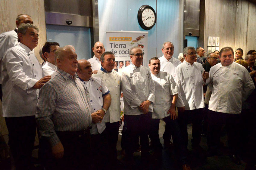 17 de estos cocineros explican sus mejores recetas aderezadas con notas biográficas en el libro “Cascajares, tierra de cocineros“, que ayuda a entender la formación de esta cantera de cocineros castellanos. De la más de una treintena de cocineros salidos de Cascajares, el libro recoge las historias -y también algunas de sus recetas- de profesionales como Alejandro Martín Domínguez, “El pequeño de tres hermanos cocineros”; Alfredo Barbolla, “El postre de los senadores”; Ángel Gutiérrez, “El secreto del asador”; Francisco Vicente Barbolla, “Un sueño cumplido, Maldonado 14”; Jesús Barbolla, “El jefe de Jockey y Samarkanda”; José Ramos Martín Domínguez, “El cocinero que quiso ser su propio jefe”; José Sanz Sanz, “El cocinero de los senadores”; Julián Barbolla Barbolla, “La cocina como amor propio”; Miguel Ángel Villas Sanz, “El segundo de Txistu”; Ovidio Pereira Espinel, “El descubrimiento del salmón”; Pablo Caridad Barbolla, “Los bocadillos de Beckham”; Rafael Sanz Cuenca, “El sueño de San Francisco”; Ricardo Pereira Espinel, “De la frutería a la cocina”; Zacarías Martín Domínguez, “El mayor de los hermanos, el pastelero”; Luis Yunquera, “El Cocinero del embajador”; Antonio Martín Moreno, “El hijo del vaquero” y Vicente Villas, “La vida en la carretera de Colmenar”. El libro se presentó el pasado fin de semana en Madrid (en la imagen) en tanto está prevista otra presentación en Segovia el 3 de mayo.