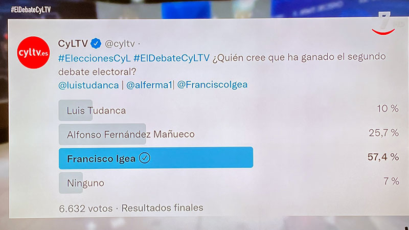 La encuesta en la cuenta de Twitter de Castilla y León televisión dio como ganador claro a Igea, con un 57,4 por ciento de los votos, detrás a Mañueco (25,7) y a Tudanca sólo le votó el 10 por ciento mientras un 7 por ciento clicó en la casilla “ninguno”. Hay otras muchas encuestas sobre “ganadores” pero le pongo esta porque la televisión regional produjo y emitió este choque a tres. Personalmente, creo que no hubo ganadores.