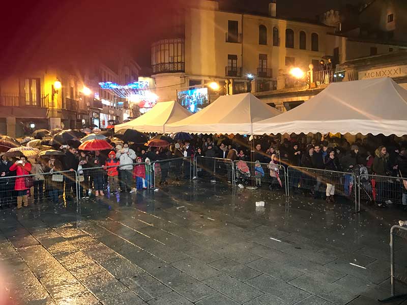 Cuando los magos se sentaban en sus tronos ante el Acueducto la lluvia se había adueñado definitivamente de la situación aunque la previsora instalación de carpas para proteger la cola de niños que quería audiencia con los Reyes hizo más llevadero el final de la celebración, aunque no para todos, que el escenario carecía de rampas que lo hicieran accesible para los usuarios de sillas de ruedas.