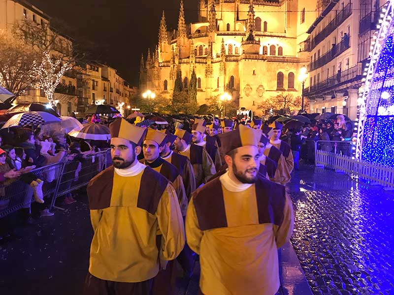 Como estaba prometido. Los Reyes Magos desfilaron por Segovia desafiando a la lluvia —la temperatura no fue un problema, que era más que aceptable— y esperando incluso la nieve que solo llegó varias horas más tarde. Lo hicieron a pie desde la plaza Mayor, “por seguridad” según contaban los organizadores de la concejalía de Cultura que al final también permitieron que Dundú, el gigante luminoso, recorriera todo el camino entre el Alcázar y el Acueducto.