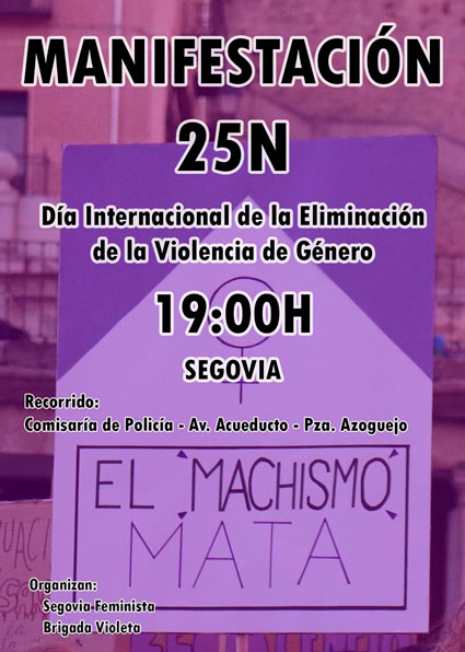 El 25N se ha convertido por derecho en jornada de concienciación contra la violencia de género, una jornada que en la provincia tendrá diversos escenarios, el principal, la manifestación que a las 19 horas partirá frente a la comisaría de Segovia, y organizada por Segovia Feminista y Brigadas Violetas. Previamente, a las 17 horas, en la Plaza Mayor se recordará a las 51 mujeres asesinadas a lo largo de este 2019, en acto organizado por el Consejo de la Mujer.