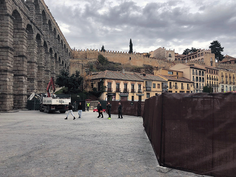 Mientras tanto, la zona de obras de San Juan se ha ampliado a la plaza Oriental, a los pies del Acueducto, donde se ha iniciado la instalación de una nueva tubería de abastecimiento de la red de agua potable, el tramo que unirá la conducción instalada en San Juan y la que llega desde la plaza de la Artillería destinada a abastecer al recinto amurallado.