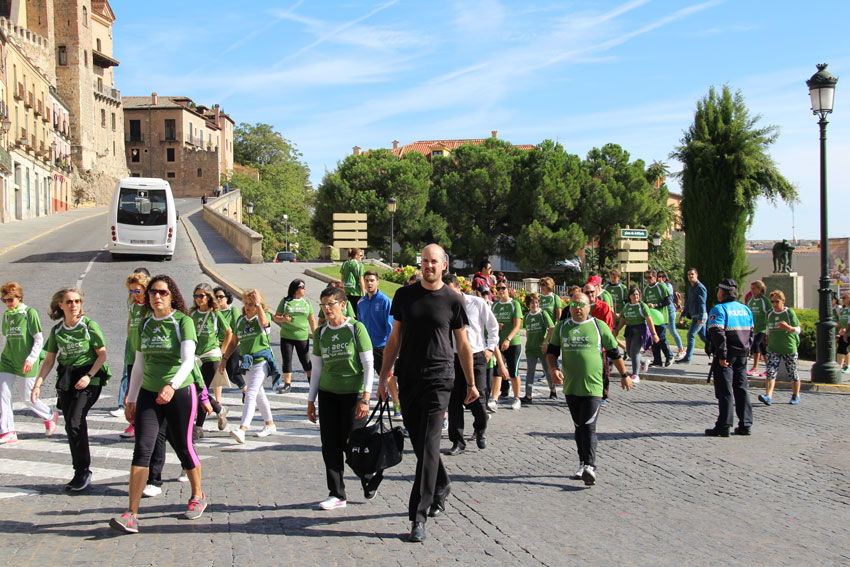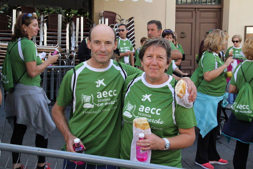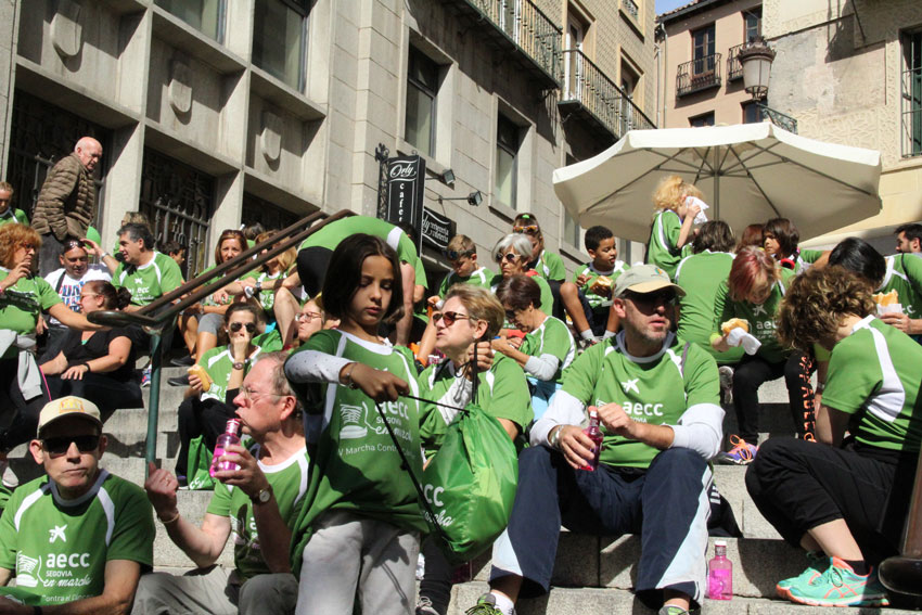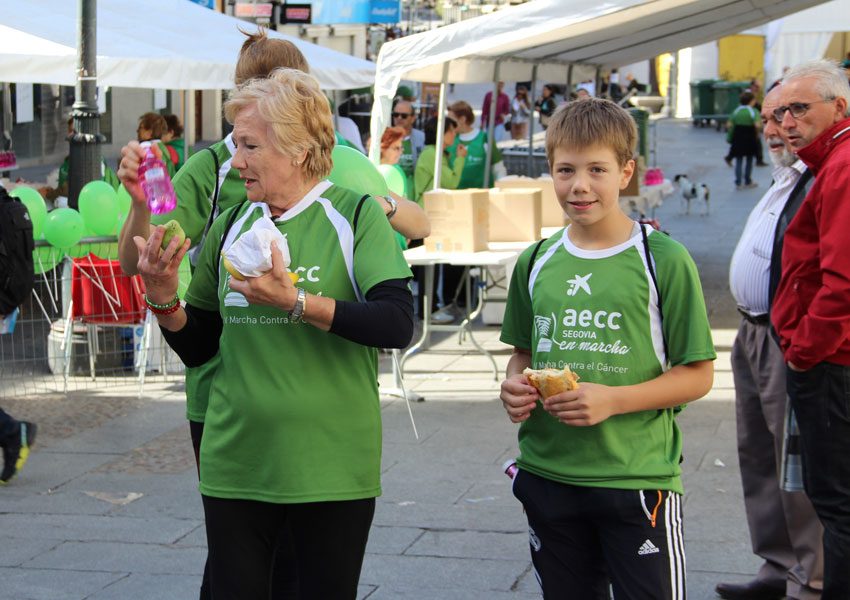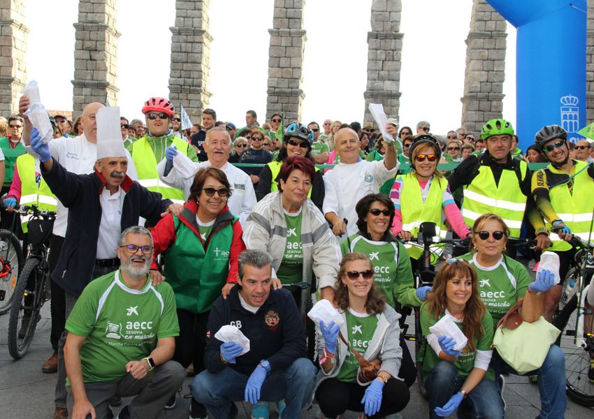 Un éxito como siempre la Marcha contra el Cáncer, organizada por aecc Segovia por cuarto año, y que nuevamente atrajo a miles de segovianos. Las 2.800 camisetas solidarias que a razón de 7 euros aportan fondos a aecc para mejorar sus servicios asistenciales y hasta colaborar en proyectos de investigación, prácticamente se agotaron -2.700 vendidas-, en tanto unos 2500 participantes empezaron la marcha a las 10:30 horas. Añadan dos centenares largos de voluntarios, desde la asociación de cocineros, asociaciones de promoción de la bici y los propios voluntarios de aecc en labores logísticas.