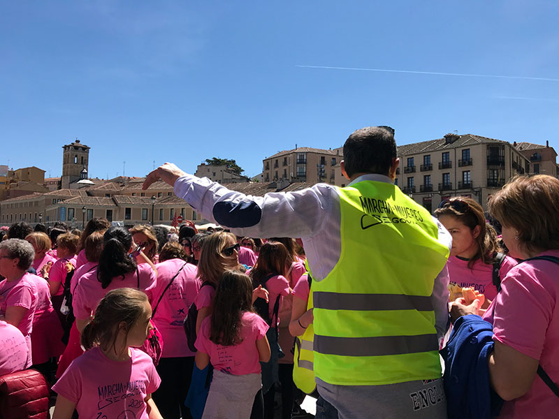 Ese fue precisamente el papel de muchos hombres esta mañana del 5 de mayo: observadores y voluntarios de la organización. Repartidores de bocadillos, apoyos a la policía local en los cruces, “colocadores” para la tradicional foto aérea a los pies del Acueducto, esta vez un motivo floral diseño del artista segoviano, Luis Moro. Los roles en este acontecimiento están claros: las protagonistas son ellas.