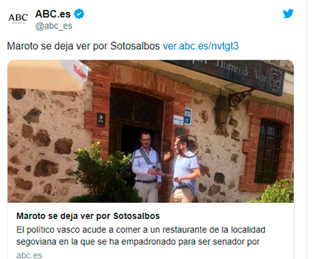 El documento lo publicaba ABC, a partir de una imagen tomada el 22 de agosto. Para facilitar su nominación como senador por Castilla y León, el político vasco, que no consiguió escaño por Álava en las últimas elecciones, Maroto se empadronó en Sotosalbos en casa de unos amigos. Posteriormente señaló que estaba en trámites de alquilar una vivienda en el turístico municipio serrano, de menos de 100 habitantes y que “se le vería mucho por Sotosalbos”. Así ha sido en parte, algunos vecinos han reconocido haber visto al político popular por las calles del pueblo. La foto publicada en el Twitter de ABC es la primera que se obtiene de la nueva localidad de Maroto.