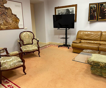 El despacho del señor alcalde. Nótese la amalgama estilística, al fondo los controvertidos visillos. Mazarías durante el pase de fotos. Más detalles de elementos ornamentales no resueltos. Arriba, sala de espera.