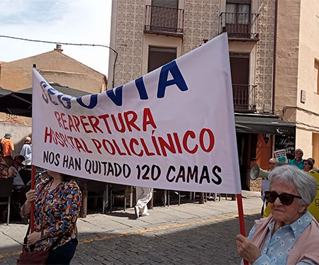 Entre 500 y mil segovianos salieron el sábado 6 de mayo a la calle para defender la sanidad pública. Bajo el lema “por nuestra salud, sanidad pública”, los manifestantes salieron del Azoguejo convocados por la por la Asamblea 6M, con amplio apoyo de los sindicatos y las fuerzas políticas de izquierda, y para converger en la plaza Mayor donde se dieron lectura a los manifiestos. En Segovia, la sanidad rural, la reclamación del policlínico se sumaron como leit motivs locales a los lemas contra la Junta, a la que acusan de no saber frenar el deterioro del sistema sanitario. Entre los asistentes, la alcaldesa Clara Martín que recordaba la situación de falta de concrección de los proyectos sanitarios diseñados por la Junta en Segovia.