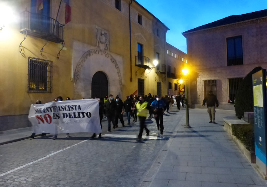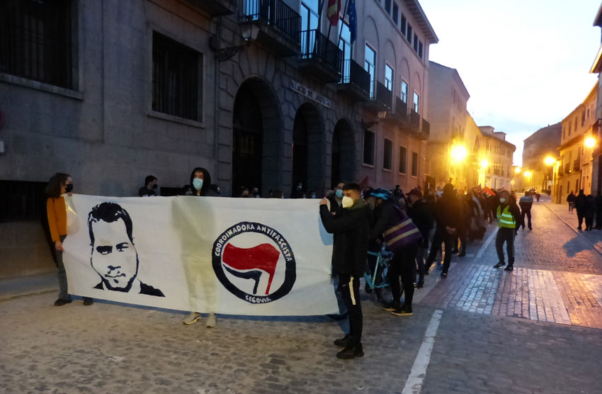 Sobre 200 manifestantes en favor de Pablo Hasel se concentraron frente al palacio de Justicia se Segovia para marchar por la avenida Acueducto hasta los jardinillos de San Roque. Convocados por diferentes organizaciones de izquierda y encabezados por una pancarta de la Coordinadora Antifascista los concentrados ocuparon un carril de la calle San Agustín habilitado para la protesta por la policía local para dirigirse hasta los jardinillos. “¡Pablo Hasel, libertad!”, “Borbones ladrones”, fueron algunas de las consignas coreadas. Entre los manifestantes, militantes de CGT, Podemos, IU y colectivos republicanos, entre otros.
