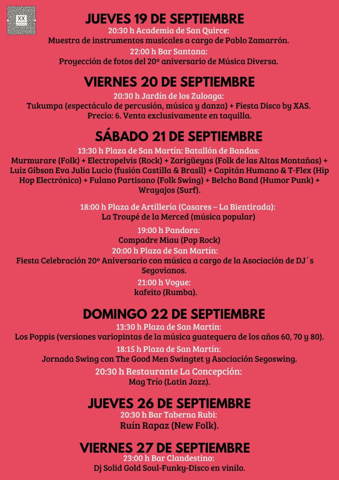 En el mensaje publicado en redes sociales, los organizadores señalan: “Buenos días Divers@s, ha costado pero al fin ha llegado… aquí tenéis la programación para esta XX edición del Festival de Música Diversa, que celebraremos desde este jueves 19 de septiembre al viernes 27 de septiembre. Volver a los orígenes siempre es gratificante”.