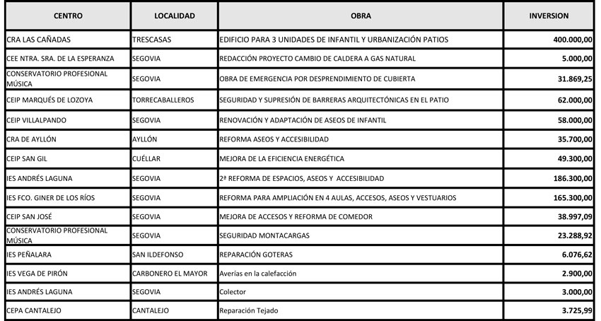 La obra se enmarca en los trabajos de reforma de centros educativos públicos, que se concentran especialmente en verano, y que este año afectan a centros de Segovia ciudad, Torrecaballeros, Trescasas, Ayllón, Cuéllar, Real Sitio de San Ildefonso y Carbonero El Mayor y Cantalejo, con una inversión de más de un millón de euros. Además, Educación ha dotado a los ayuntamientos de Abades y Turégano de subvenciones para que puedan acometer reformas en sus centros educativos. Así, la Consejería ha concedido una subvención de 250.000 euros al Ayuntamiento de Abades para la remodelación del polideportivo, para darle un uso compartido con el Centro educativo; y de 9.325e al de Turégano para la reparación de la cubierta de la zona de comedor del centro.