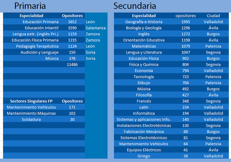 Será este un proceso de cobertura de plazas inusual para las escuelas e institutos de Castilla y León. Habitualmente, la Junta convocaba un año las oposiciones de Primaria y al siguiente las de Secundaria, y en consonancia con otras comunidades autónomas. Pero 2024 ha sido la excepción. Este año tocaba en Primaria, pero por empeño de los sindicatos y al objeto de seguir reduciendo la alta tasa de interinidad de los centros educativos, la Junta accedió a meter en el saco también a los de Secundaria. Como sea que todos los interinos de la región están obligados a concursar para ni que sea para optar a nuevas plazas de interinaje (a los que se suman recién graduados e interinos del resto de España), al final son 11.786 maestros de Primaria y 14.399 de secundaria los que se han apuntado al proceso. En total, se prevé cubrir 1.693 plazas distribuidas en 32 especialidades.