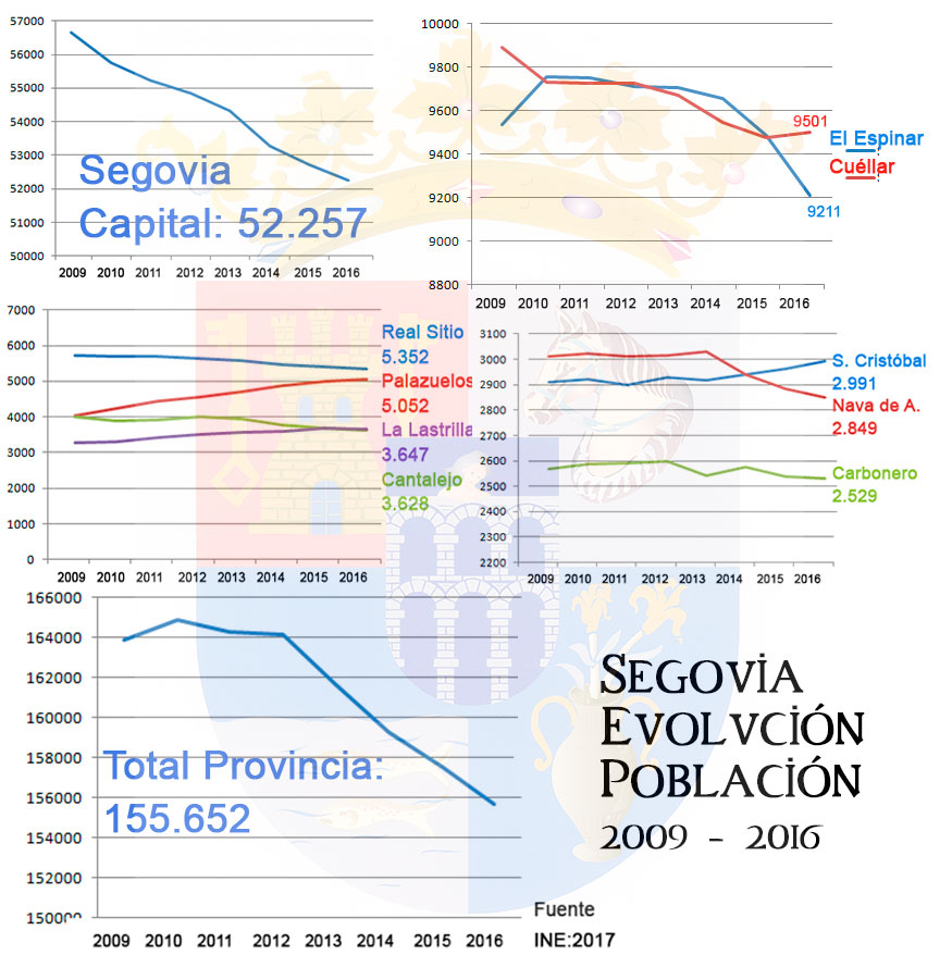 Palazuelos es, junto con San Cristóbal de Segovia, el municipio que más crece. Pero también Cuéllar, que entre 2015 y 2016 logró invertir seis años de pérdida poblacional. Así, oficialmente, la Villa contará en 2017 con 9501 vecinos, 24 más que el año anterior. Un dato que, junto con el contundente declive de El Espinar, devuelve a Cuéllar al número 2 del ránking provincial del que fue descabalgado en 2012. A El Espinar le sigue el Real Sitio de San Ildefonso y Palazuelos. Por su parte Cantalejo cede la sexta posición a La Lastrilla. en tanto en octava posición va San Cristóbal, que desde 2014 supera a Nava de la Asunción, novena en un ránking que cierra Carbonero. Le sigue Riaza, con 2.187 vecinos, que sería la undécima localidad con más de 2.000 habitantes.