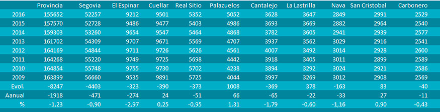 Cada diciembre, el BOE publica un RD dando cuenta de las cifras oficiales de población con efectos a partir del 1 de enero de 2016. Este dato es de vital importancia tanto para evaluar el comportamiento demográfico de los diferentes municipios como para fijar la aportación a cada municipio en las transferencias de participación en los ingresos generales del Estado (una de las fuentes de financiación más importantes de los ayuntamientos), entre otros aspectos. Estas cifras toman por base los datos de los padrones municipales de 1 de enero de 2016, por lo que no refleja la realidad de la evolución de los padrones a lo largo de 2016. Así por ejemplo, aunque “administrativamente” Palazuelos de Eresma, la localidad que más crece, cuenta en 2017 con 5.052 vecinos, a fecha de 31 de diciembre el padrón municipal reflejaba casi 200 vecinos más.