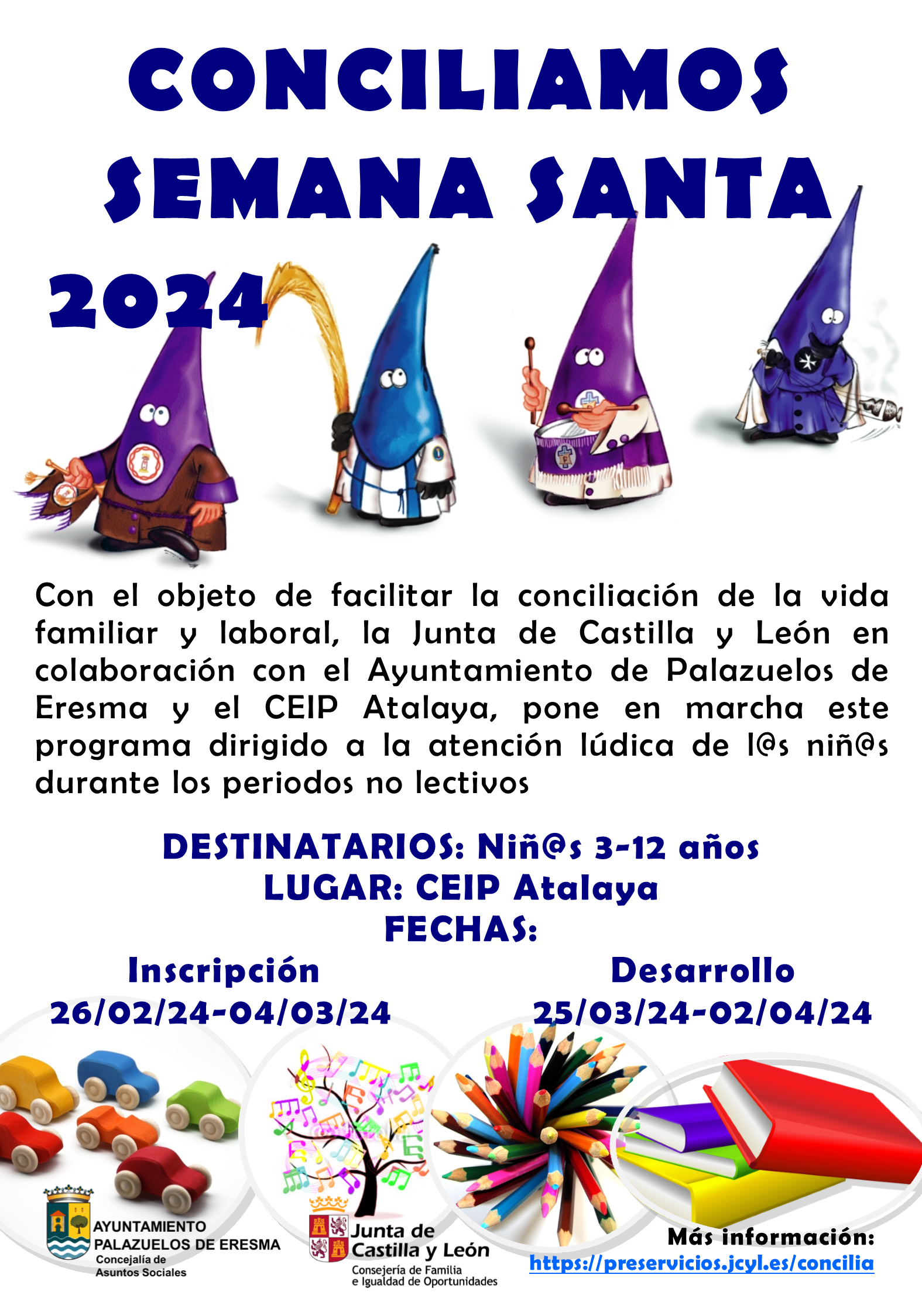 La Junta de Castilla y León, en colaboración con el Ayuntamiento de Palazuelos de Eresma y la dirección del CEIP Atalaya, ofrece el programa Conciliamos, dirigido a la atención lúdica de los menores con el objetivo de facilitar la conciliación de la vida familiar y laboral.