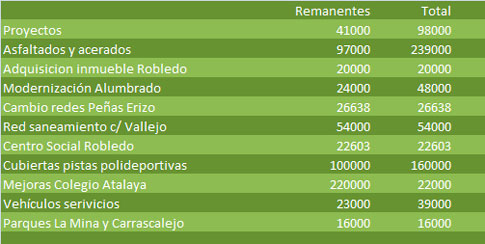 Se presupuesta la compra de un inmueble en Robledo, por 20.000€, un tema un tanto “misterioso” sobre el que no se aportaron más que vagas explicaciones relacionadas con una futura dependencia municipal destinada a uso social. La partida de modernización de alumbrados queda en 48.000€, en tanto a la sustitución de tuberías de fibrocemento de Peñas del Erizo se van 26.000€, en tanto otros 52.000 serán para la calle Vallejo García (Palazuelos). Más para Robledo, otros 22000€ se invertirán en el centro social en tanto buena parte de los 160.000€ de cubiertas para pistas polideportivas irán para la urbanización, juntamente con una partida para idéntico fin en Carrascalejo. A mejoras en la escuela La Atalaya van 22.000€, 39.000 para vehículos de servicios, y 16.000€ para la mejora de los parques de La Mina y Carrascalejo. También se destinarán 23.000€ a una campaña especial de limpieza.