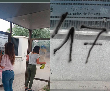La pasada semana apareció en una marquesina de Palazuelos una burda pintada. Un nombre o apodo y unas fechas, a modo de las que estilan los quintos para “celebrar” sus fiestas. Parecía una chiquillada y, además, fácil de identificar (especialmente si se “firma”) en un pueblo en el que, a pesar de su abundante población juvenil, todos se conocen. Y es lo que pasó. Identificadas los “pintores”, estos reconocieron su error, a través de familiares pidieron perdón públicamente en las redes sociales y ni cortas ni perezosas limpiaron la pintada dejando constancia del gesto.