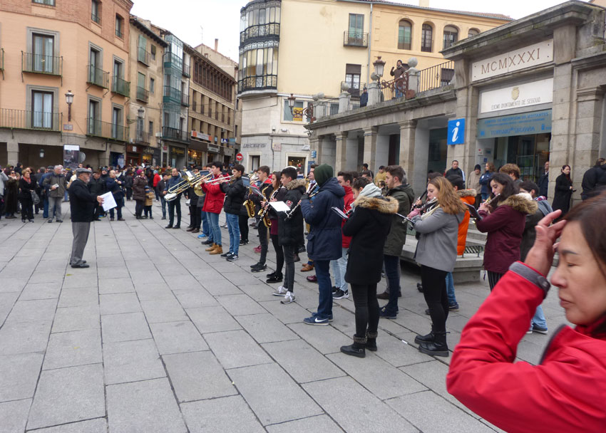 Cumpliendo con la tradición de Santa Cecilia, la Unión Musical Segoviana deleitó a los turistas y paseantes del Azoguejo con un improvisado concierto de banda. Pasadobles y piezas clásicas intepretadas por los jóvenes componentes de la banda que, además, propiciaron un pasacalles de lo más musical calle Real arriba.