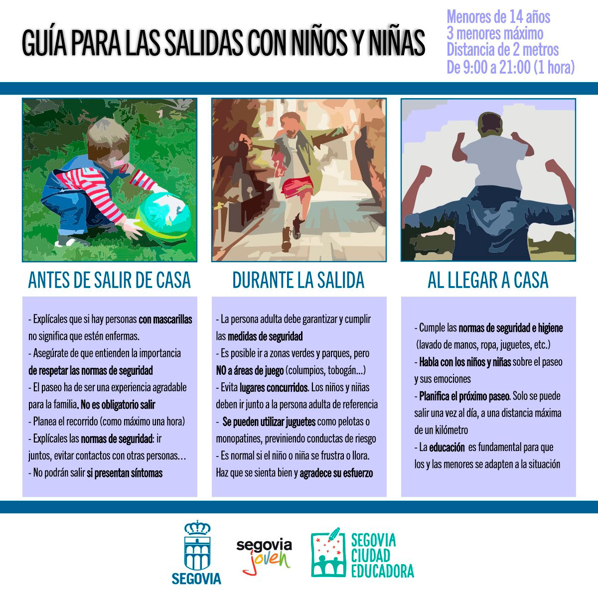 Lo cierto es que el BOE donde se publica el decreto apenas da unas indicaciones generales, pero para evitar confusiones, el ministerio de Derechos Sociales ha divulgado una Guía de buenas prácticas en las salidas de la población infantil durante el Estado de Alarma dónde sí se entra en detalles. A mayor abundamiento, el Ayuntamiento de Segovia ha editado otra guía donde se resumen las condiciones del paseo y se aconsejan pautas como evitar lugares concurridos, extremar las normas de higiene, y ser especialmente paciente y didáctico con los menores.