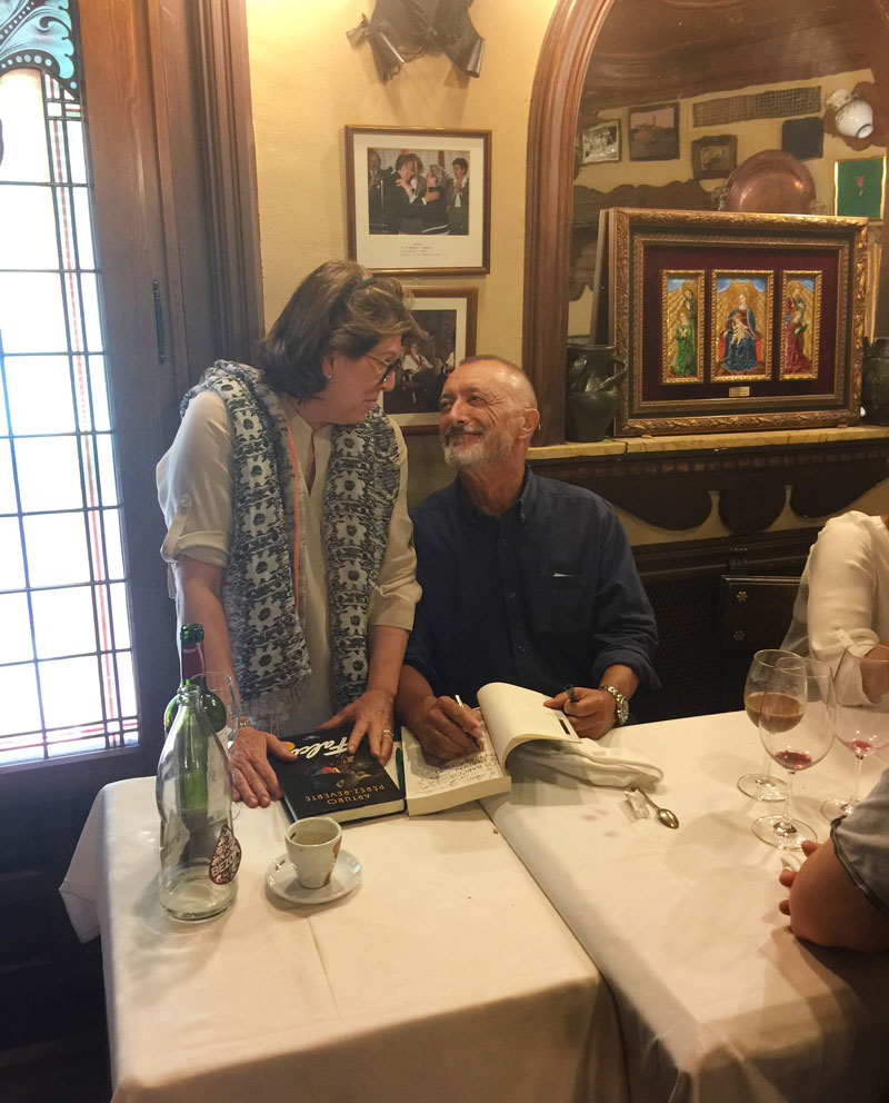 El escritor y académico Arturo Pérez Reverte recaló en Cándido el 15 de agosto, donde degustó las especialidades tradicionales. En la imagen, el novelista firmando en el libro de honor del establecimiento y junto a la propietaria del mismo, Marisa Duque.
