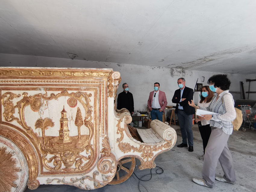 La intervención consiste en la reintegración volumétrica de los elementos desprendidos o deteriorados, consolidación estructural del soporte, con desinsectación preventiva; limpieza integral con raspado de la suciedad y de barnices alterados y repintes; reintegración de la policromía, barnizado de protección, y revisión y restitución de todos los anclajes, incluso para permitir la colocación ocasional y excepcional de la imagen de la Virgen en la carroza. La intervención tiene un plazo de ejecución de cinco meses y ha sido adjudicada a Victoria Postigo Llorente por un presupuesto de 16.177€ cofinanciados con fondos FEDER. No está previsto que la carroza restaurada pueda participar en actos procesionales, por lo que se procederá a su exposición y musealización.
