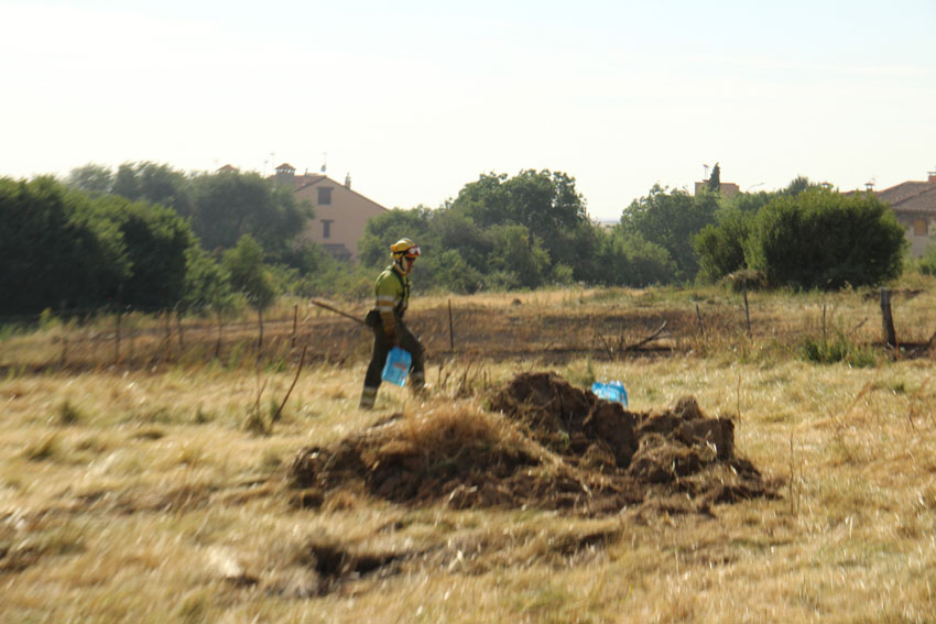 Inciso. Esto es duro. Dar paladas con una especie de remo de caucho a saber a cuántos grados, respirando humo, y saltando de aquí para allá. Eso durante horas y más horas. No es como un vecino, que en un momento dado empieza a pegarse contra las llamas (con palas, con improvisados escobones de ramas y cuando se cansa lo deja). Lo de los vecinos es de agradecer, claro, pero lo de estos profesionales…